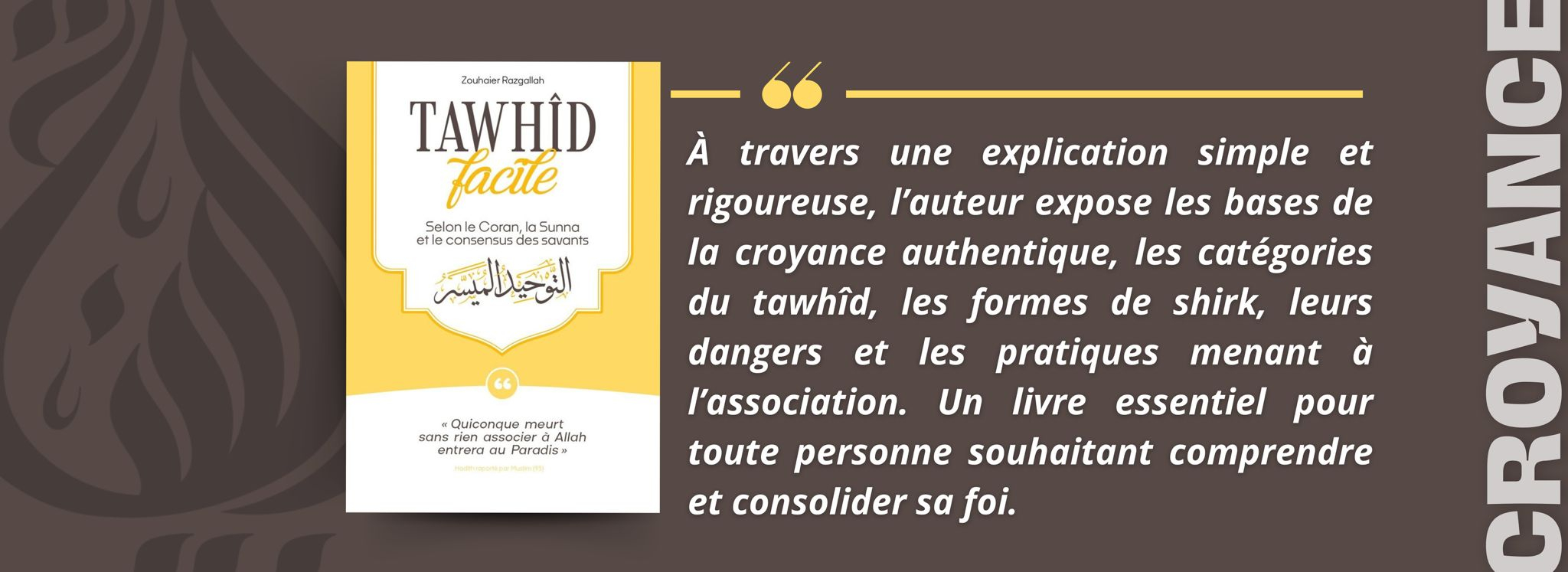“Tawhîd facile” est un ouvrage clair et structuré destiné à faciliter l’apprentissage de l’Unicité d’Allah selon le Coran, la Sunna et le consensus des savants. À travers une explication simple et rigoureuse, l’auteur expose les bases de la croyance authentique, les catégories du tawhîd, les formes de shirk, leurs dangers et les pratiques menant à l’association. Un livre essentiel pour toute personne souhaitant comprendre et consolider sa foi..