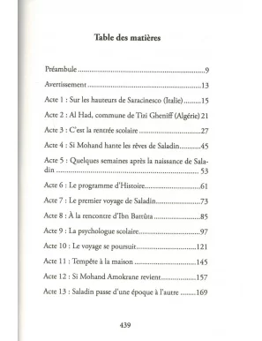 Divisé en 21 actes et agrémenté, en fin d’ouvrage, de 19 biographies présentant succinctement la vie des personnages historiques cités, « Saladin et l’anneau magique » transporte le lecteur vers de nombreux horizons. Saladin accompagne le grand voyageur Ibn Battûta (1304-1377) dans son périple. Il voyage, au gré de ses pérégrinations, d’une époque à une autre et rencontre en personne l’historien Ibn Khaldoun, le chirurgien andalou Aboulcassis, le géographe al Idrissi, le roi Roger II, etc. Cependant, un étrange personnage dans le passé tente à maintes reprises de lui ôter la vie.