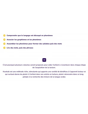 Plus qu'une simple histoire, ce livre proposera à votre enfant d'écouter et réécouter le nom des personnages-lettres, leurs sons, le nom de leurs lieux de vie ainsi que des chansons en arabe pour mieux retenir le vocabulaire rencontré ! Il contient même un mode quiz pour tester les connaissances !