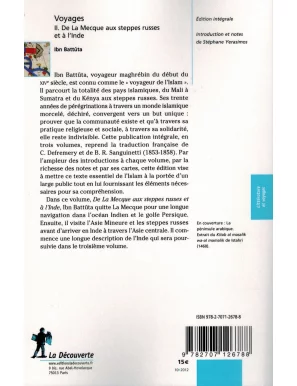Ibn Battûta, voyageur maghrébin du début du XIVe siècle, est connu comme le « voyageur de l'Islam ». Il parcourt la totalité des pays islamiques, du Mali à Sumatra et du Kenya aux steppes russes. Ses trente années de pérégrinations à travers un monde islamique morcelé, déchiré, convergent vers un but unique : prouver que la communauté existe et qu'à travers sa pratique religieuse et sociale, à travers sa solidarité, elle reste indivisible. Cette publication intégrale, en trois volumes, reprend la traduction française de C. Defremery et de B. R. Sanguinetti (1853-1858). Par l'ampleur des introductions à chaque volume, par la richesse des notes et par ses cartes...