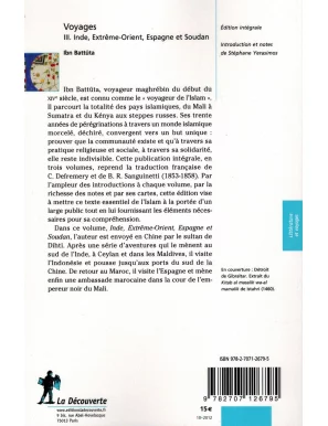 Ibn Battûta, voyageur maghrébin du début du XIVe siècle, est connu comme le « voyageur de l'Islam ». Il parcourt la totalité des pays islamiques, du Mali à Sumatra et du Kenya aux steppes russes. Ses trente années de pérégrinations à travers un monde islamique morcelé, déchiré, convergent vers un but unique : prouver que la communauté existe et qu'à travers sa pratique religieuse et sociale, à travers sa solidarité, elle reste indivisible. Cette publication intégrale, en trois volumes, reprend la traduction française de C. Defremery et de B. R. Sanguinetti (1853-1858). Par l'ampleur des introductions à chaque volume, par la richesse des notes et par ses cartes...