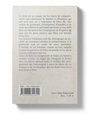 Ce livre est un voyage sur les traces de comportements rares provenant de femmes et d’hommes qui ont voué leur vie à l’adoration de Dieu. Des actions de générosité, d’abnégation, d’humilité et de vertu, qui reflètent la spiritualité profonde et sans faille dont ont fait preuve les Compagnons du Prophète (psl) ainsi que les pieux anciens, que Dieu soif Satisfait d’eux tous.