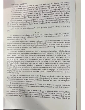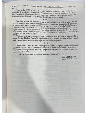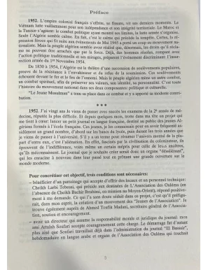 De 1830 à 1954, l'Algérie est le théâtre d'une succession de soulèvements populaires, preuve de la résistance à l'envahisseur et du refus de la soumission. Ces soulèvements échouent devant le fer et le feu de l'ennemi. Mais le peuple algérien mène un autre combat, un combat spirituel, afin de préserver ses valeurs, son identité, sa personnalité. C'est toute l'histoire du mouvement national dans ses deux composantes: poli- tique et culturelle. "Le Jeune Musulman" a tenu sa place dans ce combat et y a apporté sa modeste contribution. Aujourd'hui, près d'un demi siècle après sa parution j'ai pensé qu'une réédition du "Jeune Musulman" pouvait être instructive pour les jeunes algériens de l'an 2000, Ils y constateront que la guerre de libération à été précédée d'une longue résistance de leurs pères pour préserver leur âme. «Le Jeune Musulman» en constitue un aspect qui mérite d'être rappelé.