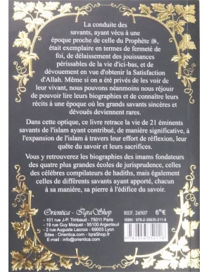 Vous y retrouverez les biographies des imams fondateurs des quatre plus grandes écoles de jurisprudence, celles des célèbres compilateurs de hadiths, mais également celles de différents savants ayant apporté, chacun à sa manière, sa pierre à l'édifice du savoir.Ce livre contient la biographie des 21 savants et érudits suivants :