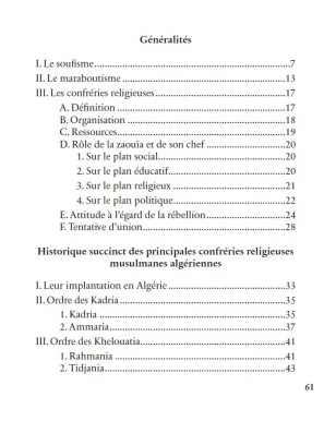 Le commandant Jacques Carret, arabisant et réputé pour la qualité de ses travaux ainsi que pour son impartialité fut chargé de mener une étude sur le maraboutisme. Il rédigea un compte-rendu complet sur les confréries religieuses, leurs organisations et leurs rôles, leur rapport à l’autorité française et l’historiographie des principales confréries présentes en Algérie. Après l’édition de son rapport sur l’Association des oulémas d’Algérie, la publication de celui-ci permettra aux lecteurs et aux chercheurs d'avoir un panorama complet du paysage religieux algérien pendant la colonisation.