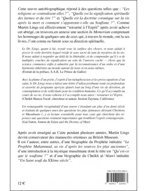 Cette œuvre autobiographique répond à des questions telles que : “Les religions se contredisent-elles ?”, “Quelle est la signification spirituelle des larmes et du rire ?” et “Quelle est la doctrine coranique sur la vie après la mort et comment s’apparente-t-elle au Soufisme ?”. Comme Martin Lings est effectivement « retourné à l’Esprit » après avoir achevé cet abrégé, on trouvera en annexe une section In Memoriam comprenant les hommages de quelques-uns de ceux qui, à travers le monde, ont lu ses livres, l’ont connu ou furent sous sa direction spirituelle. « Le Dr. Lings, quant à lui, voyait sous la surface des choses, et nous aidait à percer le voile derrière lequel réside le sens sacré de tant de mystères de la vie. Il nous aidait à regarder au-delà de la littéralité, et de comprendre qu’il y a de multiples couches de signification au sein de l’univers caché chose que la science commence enfin à admettre par la reconnaissance d’un ordre et d’une harmonie inhérents au monde autour de nous et en nous-mêmes ». Extrait de la préface de S.A.R. Le Prince de Galles.