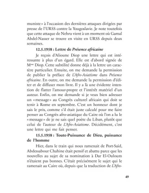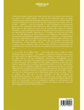 « Quand al-Wardi m’avait rendu visite l’autre soir, il m’a raconté une scène où l’on voit le Dr Lamine pleurer, ce qui est fort inattendu pour un zaïm. L’intellecto-zaïm avait demandé des précisions au sujet de Lazhar Cheriet. Et quand al-Wardi lui eut raconté la fin du héros, abattu par les acolytes de A. R., le zaïm — paraît-il — s’est mis à pleurer. Ce qui m’intéresse, ce n’est pas ses larmes ou son émotivité, mais l’ignorance qu’ils cachent ! Car comment se fait-il que ce zaïm ignore ce que tout le monde sait, même les simples étudiants, à savoir que Lazhar Cheriet a été exécuté par les mêmes mains qui ont exécuté Ben Boulaïd, Laghrour, etc. ? Pourquoi cet homme est-il zaïm avec une telle absence de sens critique et d’intelligence des situations ? Il aura traversé la Révolution algérienne et même — dérision ! — il l’aura dirigée sans rien comprendre à sa signification et à ses dessous. Mais au fond, c’est bien pour cela qu’il est zaïm, c’est-à-dire soit un complice conscient du colonialisme — ce que Lamine n’est pas — soit un homme de tout repos qui ne pose aucune question dans une étrange situation où précisément le colonialisme ne veut pas de poseurs de questions qui peuvent déranger son jeu. »