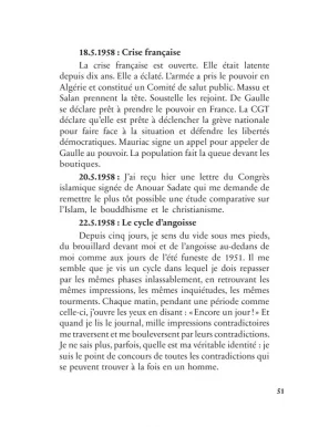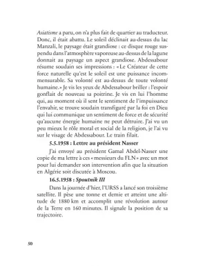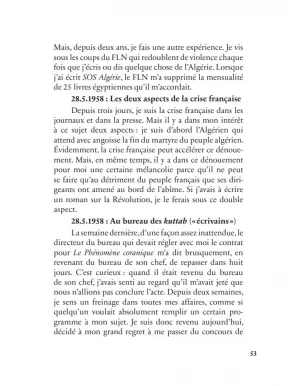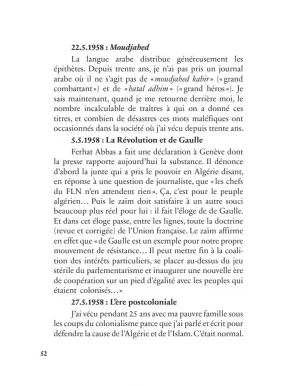 « Quand al-Wardi m’avait rendu visite l’autre soir, il m’a raconté une scène où l’on voit le Dr Lamine pleurer, ce qui est fort inattendu pour un zaïm. L’intellecto-zaïm avait demandé des précisions au sujet de Lazhar Cheriet. Et quand al-Wardi lui eut raconté la fin du héros, abattu par les acolytes de A. R., le zaïm — paraît-il — s’est mis à pleurer. Ce qui m’intéresse, ce n’est pas ses larmes ou son émotivité, mais l’ignorance qu’ils cachent ! Car comment se fait-il que ce zaïm ignore ce que tout le monde sait, même les simples étudiants, à savoir que Lazhar Cheriet a été exécuté par les mêmes mains qui ont exécuté Ben Boulaïd, Laghrour, etc. ?