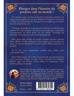 Un café turc amer, des biscuits fourrés à la pistache ruisselants de sirop au miel, supplément vue sur le Bosphore. Si Aygul n’a aucun mal à se faire à la vie stambouliote, elle ignore en revanche que son destin est sur le point de basculer. L’héritage inattendu de sa grand-mère l’entraîne au-delà des rues animées de la ville moderne : un carnet ancien la plonge au cœur de la Constantinople du XVIe siècle, où l’on célèbre l’ouverture de Kiva Han, le tout premier café au monde jamais bâti. Mais tapies dans l’ombre des siècles, certaines histoires refusent d’être effacées. Tandis qu’Aygul se laisse happer par les mystères du passé, une menace silencieuse se resserre autour d’elle chaque jour un peu plus. Et si l’on avait patiemment attendu cinq siècles pour s’en prendre à elle ?