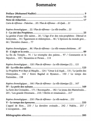 Terre des Prophètes, des pieux, des véridiques et des martyrs, lieu de pèlerinage, d’adoration et de proximité du Divin pour tous les peuples, cette métropole sacrée de l’humanité a presque toujours occupé une place de choix sur la scène du monde tant son importance religieuse et géopolitique en a fait l’ambition des plus grands rois et conquérants de toutes les époques. Soumise à toutes les vicissitudes du temps, son histoire est également inséparable, depuis des temps immémoriaux, d’un idéal suprême bâti sur un double fondement à la fois spirituel – le monothéisme absolu – et terrestre – la justice. Ce sont ces valeurs fondamentales de piété et de droiture qu’ont personnifié et matérialisé les plus grands souverains qu’aient connu al-Quds, et qui en ont fait, lors de ses âges d’or, l’un des phares des plus belles vertus, de l’ère des rois-prophètes des fils d’Isrâ’îl à celle des califes bien-guidés, et au-delà.