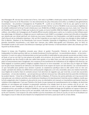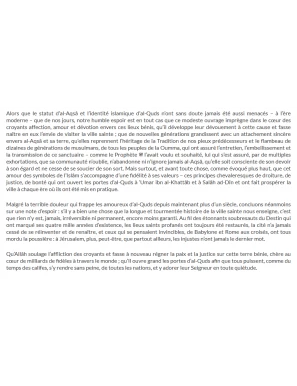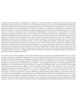 Bénie du haut des cieux et honorée par la présence de tant d’hommes aimés de l’Unique, al-Quds est fondamentale dans l’histoire, la géographie et le dogme de l’Islâm, inséparable de l’âme de la Oumma et de l’identité musulmane, inscrite en lettres d’or dans le cœur et l’esprit des croyants. Et que dire de la sacralité, des vertus et des mérites de sa sublime esplanade d’al-Aqsâ, première qibla des musulmans, seconde maison d’Allâh sur Terre, troisième mosquée sainte vers laquelle le croyant est invité à voyager ?
