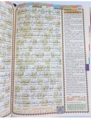 Les règles de tajwid sont données par un système de couleur intuitif pour apprendre les règles de lecture et de psalmodie du Saint Coran et le code QR (présent sur chaque page) permet d'ouvrir une vidéo sur son smartphone et d'écouter et suivre la lecture du Coran par cheikh Soudays.