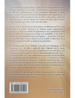 Le monothéisme compris dans la profession de foi musulmane est un principe libérateur de la raison. D’abord parce qu’il situe le divin au-delà des représentations et des conceptions humaines, et donc porte atteinte à toutes les formes de fétichismes et de superstitions. Il interdit d’accorder un pouvoir réel aux êtres et aux choses, décrétant que rien n’arrive sans la volonté du Créateur. Il rend enfin l’homme maître des biens que Dieu a mis entre ses mains.