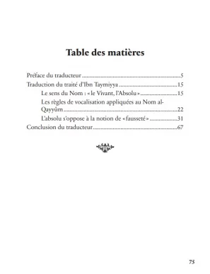 Dans son ouvrage, Ibn Taymiyya apporte une définition explicite et détaillée de ce Nom d'Allah aux lecteurs. Reconnu pour sa rigueur et son attachement au dalil, il propose une définition minutieuse d'Al-Qayyûm. Comprendre son sens profond vous permettra de mieux connaître d'Allah. Vous pourrez de ce fait vous rapprocher de Lui.