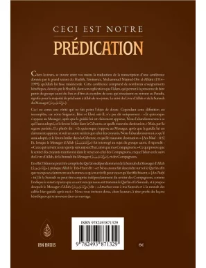 Vous tenez entre vos mains un précieux livre ! En effet, Ceci est notre prédication contient les paroles prononcées par Cheikh Al-Albanî lors d'une conférence. Qu'Allah fasse miséricorde à celui que tant de monde considère comme le plus grand muhaddith de notre ère.