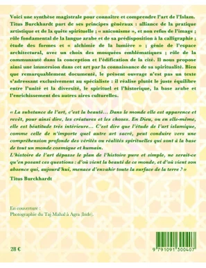 Titus Burckhardt part des principes généraux des arts islamiques : alliance de la pratique artistique et de la quête spirituelle ; « aniconisme », et non refus de l’image ; rôle fondamental de la langue arabe et de sa prédisposition à la calligraphie ; étude des formes et « alchimie de la lumière » ; génie de l’espace architectural (présenté ici à travers un choix de mosquées emblématiques) ; rôle de la communauté dans la conception et l’édification de la cité.
