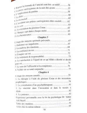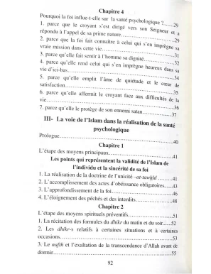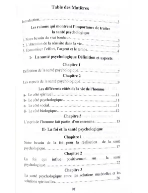 Il n'existe pas un seul homme qui n'aspire pas à cette finalité: Le bonheur du cœur et la tranquillité de l'esprit. En effet, il est évident que celui ou celle qui jouit d'une santé psychologique parfaite et équilibrée, peut affronter les difficultés de la vie, avec un esprit confiant et une volonté forte, et réussir ainsi dans tous les domaines dans lesquels il s'engage. Dans le souci d’éclaircir ce lien étroit entre la foi en Islam et l'aboutissement à l'équilibre psychologique, vous allez découvrir, cher lecteur dans ce livre le détail des points suivants :