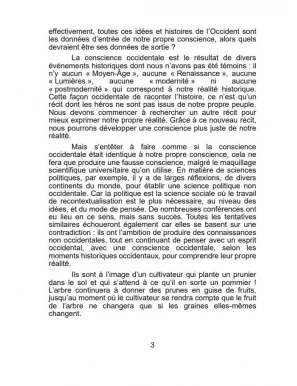 Et pourquoi un cours d’histoire va-t-il raconter l’histoire humaine universelle comme si tout le monde est et doit passer par les mêmes étapes : par le « Moyen-Âge », par la « Renaissance », par les « Lumières », par la « modernité », par la Révolution française, par la révolution industrielle qui a détruit la planète, et enfin par la « postmodernité » ? En réalité, l’histoire de la conscience occidentale n’est pas identique à de la conscience humaine mondiale.