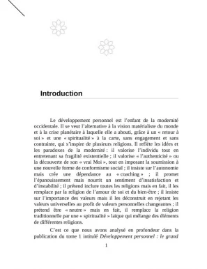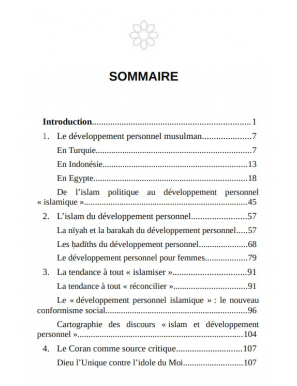 Pour répondre à ces questions, ce livre propose une étude méthodique qui permet de voir le sens qu'a pris le développement personnel « islamique » à travers l'exemple de la Turquie, du monde arabe, de l'Indonésie, de la Malaisie, de l'Afrique, du Maroc, et de l'Europe... Il permet d'évaluer le sens et la pertinence du développement personnel « islamique » à la lumière de l'islam comme vision du monde et sagesse universelles. Il sert de miroir à toute personne qui veut mieux aborder les questions d'indépendance, de confiance en soi, d'amour de soi et d'épanouissement...