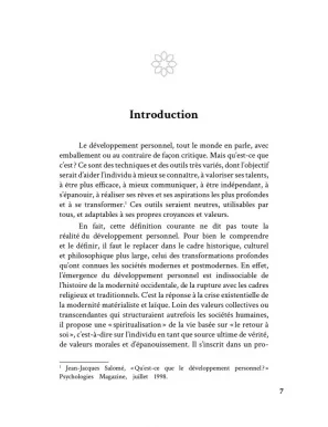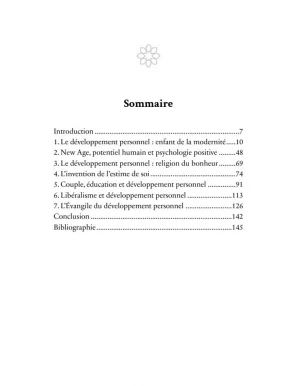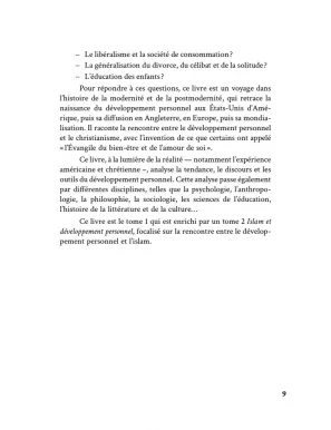 Ce livre est un voyage dans l'histoire de la modernité, dans l'histoire de la psychologie moderne, avec la naissance du développement personnel aux États-Unis d'Amérique, puis sa mondialisation. Il raconte la rencontre entre le développement personnel et le christianisme, sa « christianisation » ainsi que sa critique chrétienne. Enfin, il montre son impact sur le couple et l'éducation.