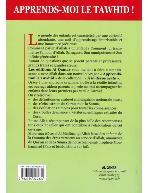 Pour vous aider dans votre mission, les éditions Al Qamar vous proposent un outil inédit et original, sous forme de dialogues professeur/élèves. Cette mise en scène captivera l’attention des enfants et attisera leur curiosité sur le sujet. Grâce à une approche fidèle à la réalité infantile, cet ouvrage peut constituer un outil de jeux en famille pour les parents désireux d’accompagner leurs enfants dans leurs premiers pas vers le Tawhid.