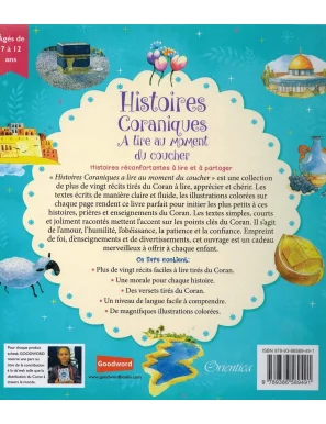 "Histoires Coraniques à lire au moment du coucher" est une collection de plus de vingt récits tirés du Coran à lire, apprécier et chérir. Les textes écrits de manière claire et fluide, les illustrations colorées sur chaque page rendent ce livre parfait pour initier les plus petits à ces histoires, prières et enseignements du Coran. Les textes simples, courts et joliment racontés mettent l'accent sur les points clés du Coran. Il s'agit de l'amour, l'humilité, l’obéissance, la patience et la confiance. Empreint de foi, d'enseignements et de divertissements, cet ouvrage est un cadeau merveilleux à offrir à chaque enfant.