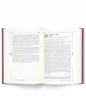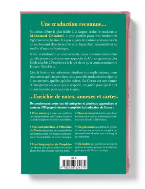 Cette traduction de Mohamed Chiadmi est l’une des meilleures en langue française. Enrichie par 200 pages d’annexes (histoire du Coran, vie du Prophète, cartes, glossaire et index), elle s’est imposée comme une référence incontournable. Grand Format. Couverture rigide haut de gamme, avec signet. Ouvrage relié, Français uniquement, 2 couleurs.