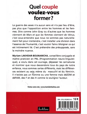 Tous les hommes seraient-ils vraiment virils, attachés aux résultats, à l'action, sans trop d'émotion, peu loquaces, axé sur la séxualité...Et toutes les femmes seraient-elles vraiment émotives, bavardes, décentrées, influençables, axée sur la tendresse ? Nous n'avons pas besoin d'être expert pour constater autour de nous que c'est parfois l'inverse que l'on observe dans certains cas. Qui ne connait pas un homme qui n'a pas le sens de l'orientation, qui est tête en l'air, dépensier, qui aime faire les courses, la cuisine, qui bavarde, est sensible et susceptible ? Et qui ne connait pas une femme pragmatique qui a le sens de l'orientation, de l'organisation, qui est prévoyante, économe, qui n'aime pas faire les courses, la cuissine, qui ne montre pas quand elle se trompe... ? L'auteur à travers une enquête de terrain, a voulu dépasser les archétypes, en observant et en analysant le témoignage de couple. Elle va distinguer 8 profils d'hommes et de femmes, et dresser 16 combinaisons possibles de couple. Elle décrit leur réalité quotidienne et propose des solutions à leurs problèmes conjugaux afin qu'à tous les couples on gagne !!! ( a tous les couples on gagne était le premier titre de ce livre, mais il a été changé par quel couple voulez vous former ? Pour une compréhension plus claire auprès des lecteurs.)
