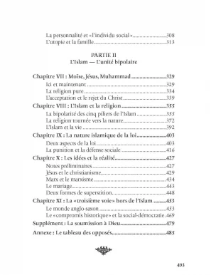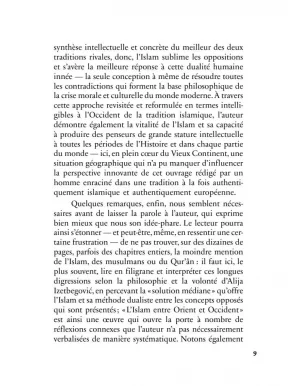 À l'inverse, l'Islam, par son essence intégrale, embrasse pleinement la nature de l'Homme dans toute sa bipolarité et sous tous ses aspects: la conscience et la matière, l'âme et le corps, la spiritualité et la nature, la pensée et la pratique, la culture et la civilisation, ce monde et l'autre. Par cette synthèse intellectuelle et concrète du meilleur des deux traditions rivales, donc, l'Islam sublime les oppositions et s'avère la meilleure réponse à cette dualité humaine innée - la seule conception à même de résoudre toutes les contradictions qui forment la base philosophique de la crise morale et culturelle du monde moderne.