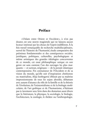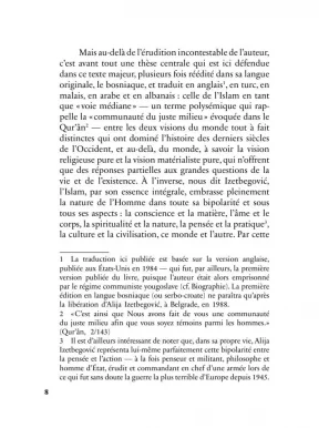 Si Alija Izetbegović y éblouit par sa maîtrise impressionnante de tous les sujets abordés, au-delà de l'érudition incontestable de l'auteur, c'est avant tout une thèse centrale qui est ici défendue dans cette approche revisitée et reformulée en termes intelligibles à l'Occident de la tradition islamique : celle de l'Islam en tant que « voie médiane » entre les deux visions du monde tout à fait distinctes que sont la religion pure et le matérialisme, qui n'offrent que des réponses partielles aux grandes questions de la vie et de l'existence.