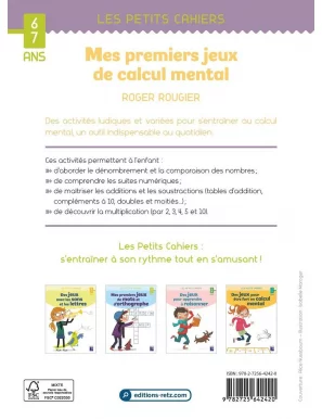 D’une façon ludique, progressive et efficace, ce cahier propose des activités de calcul mental tout en favorisant l’analyse et le raisonnement. Les enfants sont amenés à prendre conscience des démarches qui leur permettent de réussir. À travers des énigmes, des problèmes et des jeux, ils apprennent à réfléchir, à calculer « de tête », à anticiper le résultat, à évaluer une quantité, à calculer les doubles et les moitiés, à rechercher le complément à la dizaine, à additionner et soustraire…