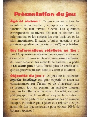 Objectifs du jeu : Les jeux de la collection Muslim Challenge ont pour objectif de tester ses connaissances sur l’islam et de s’instruire dans sa religion tout en passant un agréable moment seul, en famille ou entre amis... En effet, cet outil pédagogique est le meilleur moyen de s’initier à l’islam ou de parfaire ses connaissances de manière ludique. N’hésitez pas à jouer et à rejouer à ce jeu autant de fois que nécessaire pour obtenir 100% de bonnes réponses !