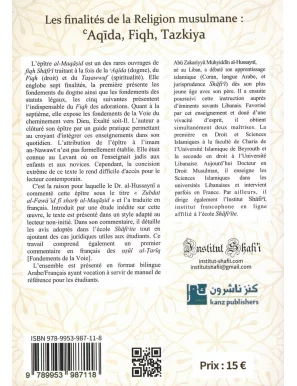 C'est la raison pour laquelle le Dr. al-Hussaynî a commenté cette épître sous le titre « Zubdat al-Fawā’id fī sharḥ al-Maqāṣid » et l’a traduite en français. Introduit par une étude inédite sur cette œuvre, le texte est présenté dans un style adapté au lecteur non-initié. Dans son commentaire, il détaille les avis adoptés dans l’école shāfiᶜite tout en ajoutant des cas juridiques utiles aux étudiants. Ce travail comprend également un premier commentaire en français des uṣūl al-Ṭarīq [Fondements de la Voie]. L’ensemble est présenté en format bilingue arabe/français ayant vocation à servir de manuel de référence pour les étudiants.