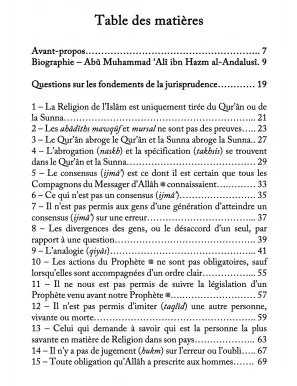 Dans cet extrait de son célèbre ‘Al-Muhallâ bi-l-Athâr’, une véritable encyclopédie dans le domaine de la jurisprudence (fiqh), et de son traité ‘Al-Nubdha al-Kâfiya fi Ahkâm Usûl ad-Dîn’, Ibn Hazm expose et explique brièvement les principes juridiques uniques sur lesquels son approche est fondée. Il ne s’agit toutefois pas des principes d’une école à part entière, puisqu’Ibn Hazm rejetait l’imitation (taqlîd), mais plutôt d’une méthodologie, uniquement fondée sur le Qur’ân, la Sunna et le consensus des Compagnons, tout en rejetant l’analogie et l’opinion individuelle sous toutes leurs formes. Ibn Hazm suivait en effet la voie dite « littéraliste » des Ahl az-Zâhir (ou zahirites), ainsi nommés car ils ne s’en tenaient qu’au zâhir, c’est-à-dire au sens apparent et manifeste du Qur’ân et de la Sunna.