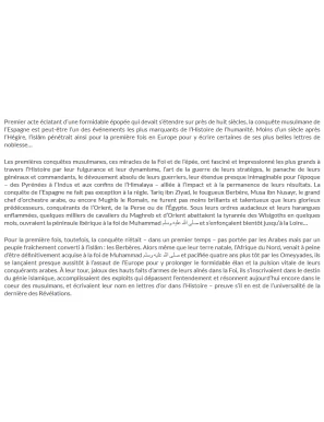 Dans ce livre, revivez le grand exploit de la conquête musulmane de l'Espagne. Celui-ci raconte également comment les divisions internes ont affaibli al-Andalus. Les royaumes chrétiens ont profité de ces conflits pour entamer la Reconquista.