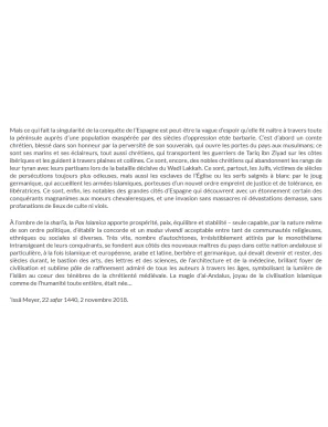 C'est ainsi qu'est née al-Andalus, cette civilisation extraordinaire qui a brillé pendant des siècles. La civilisation islamique a fait d'Al-Andalus un joyau, qui a aussi marqué l’humanité tout entière. Cette terre d'Espagne musulmane a produit des savants, des poètes, des architectes et des penseurs qui ont marqué l'histoire du monde.