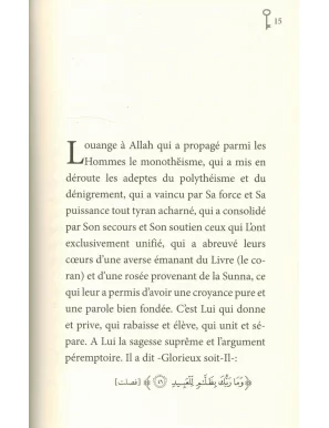 C'est pour cette parole que les cieux et la terre furent créés. Elle est la saine nature dont Allah a originellement doté toutes Ses créatures, et elle constitue la base de la religion. C'est pour elle que la Qibla fut érigée... Elle est le privilège d'Allah sur tous Ses serviteurs. Elle préserve le sang, les biens et la descendance dans la demeure d'ici-bas. elle assure le salut contre le châtiment de la tombe et contre celui de l'Enfer...