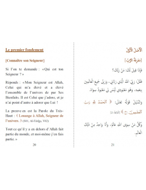 Ce livre bilingue (français-arabe, pages en vis-à-vis) présente l'épître essentielle intitulée «Les Trois Fondements et leurs preuves», rédigée par l'éminent savant cheikh Muhammad Ibn ‘Abdi-l-Wahhâb Ibn Sulaymân Al Muchrif At-Tamîmî (qu’Allah lui fasse Miséricorde), né en 1115 de l’Hégire et décédé en 1206.
