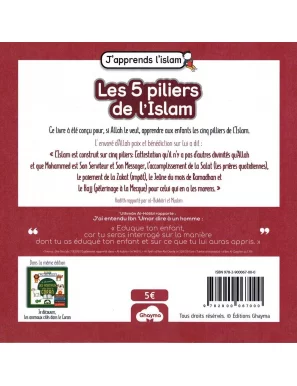 Ce livre apprend à nos enfants d’une manière ludique et pédagogique 5 principes sur lesquels se base l’islam: Les cinq piliers ! Il sollicite l’enfant tout au long en lui proposant différentes activités, puis à la fin du livre il pourra tester ces connaissances nouvelles… Des illustrations colorées Chaque pilier écrit en arabe voyellisé Des pages d’activités pour mettre en application ce nouveau savoir! Une liste de définitions des nouveaux mots Il présente une couche imperméable brillante sur l’extérieur afin d’éviter d’abîmer le livre s’il est posé sur une surface humide. L’intérieur est composé de 28 pages spéciales coloriages extra blanches.