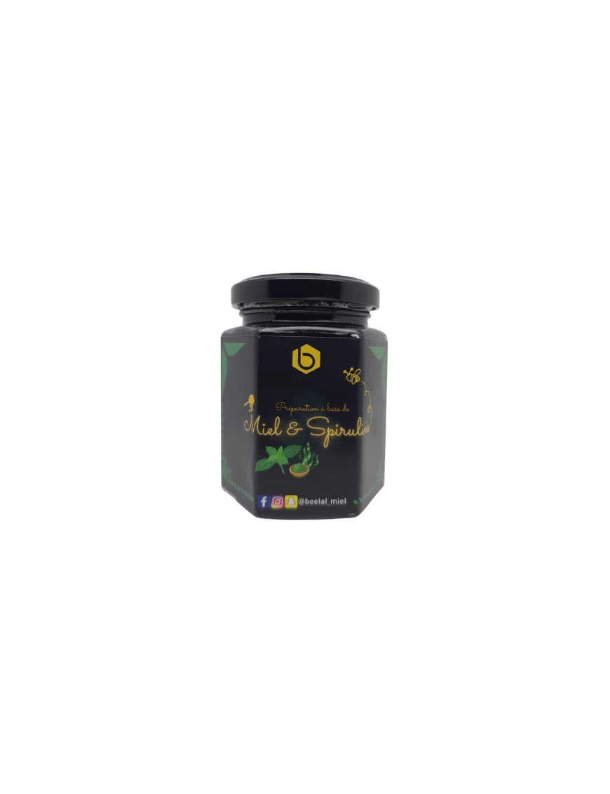 Cette savoureuse préparation à base de miel et de spiruline au goût de la menthe verte est soigneusement élaborée à partir de la spiruline et du miel d’été 100% français