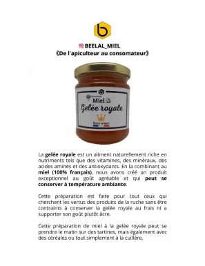 La gelée royale est un aliment naturellement riche en nutriments tels que des vitamines, des minéraux, des acides aminés et des antioxydants. En la combinant au miel (100% français), nous avons créé un produit exceptionnel au goût agréable et qui peut se conserver à température ambiante.