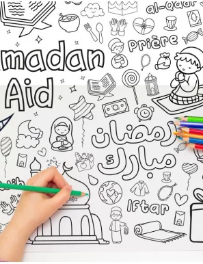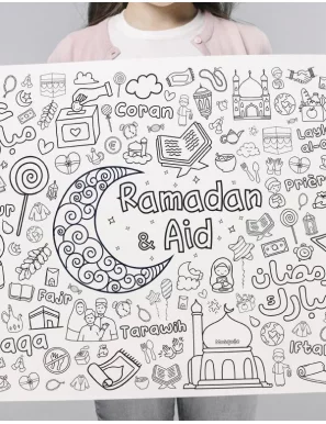 Grand poster à colorier en famille sur le thème du Ramadan et de l'Aid al-Fitr. Profite de ces 30 jours sacrés pour achever le coloriage de ces différents éléments du Ramadan et de l'Aid. Bon amusement !