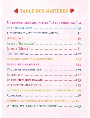 Chaque chapitre du livre repose sur un enseignement prophétique, qui met en scène le comportement exemplaire du Prophète Mohamed ﷺ, étayé par un hadith dont la référence est précisée en note de bas de page. Chaque chapitre est aussi suivi d’activités interactives et de travaux manuels qui ancrent ces leçons précieuses dans la vie quotidienne de nos enfants.