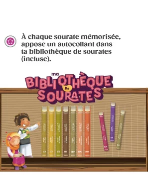 Une bibliothèque Hifdh dépliable permet à votre enfant d’ajouter des autocollants en forme de livres représentant chaque sourate mémorisée, pour visualiser ses progrès.