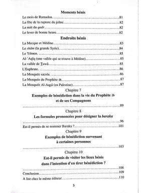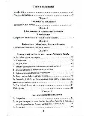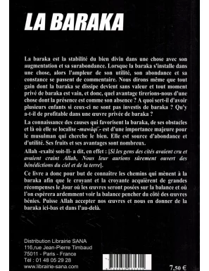 Le livre La baraka (la bénédiction) révèle les chemins qui mènent à la bénédiction d'Allah. L'auteur explique en effet les causes qui favorisent la baraka dans nos vies, que ce soit dans notre temps, nos biens, notre famille ou notre travail. Il met aussi en lumière ce qui bloque l’arrivée de cette bénédiction. Certains comportements ou attitudes, par exemple, peuvent la bloquer, même quand on pense bien faire.