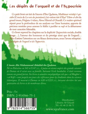 Ce petit livret est tiré de l'oeuvre de Ibn Qudama, Mukhtassar minhaj al qasidine (Concis de la voie des postulants), lui-même tiré de Ihya 'Ulum d-din du grand imam, Hujjatu-l-islam, Abou Hamid Al Ghazali. Ce maître spirituel réputé pour la profondeur de ses analyses sur l'âme humaine, apporte de précieux remède pour amener le fidèle à purifier son nafs et la débarrasser de tout caractère blâmable. Ce livret reprend les chapitres sur la duplicité (hypocrisie sociale, double visage), l'amour des honneurs et du prestige ainsi que de l'orgueil. Afin d'attirer l'attention sur ces fléaux destructeurs, nous l'avons rebaptisé : Les dégâts de l'orgueil et de l'hypocrisie.