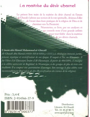 Le présent livre traite de la maîtrise du désir charnel où l’imam Al-Ghazali s’adresse aux novices de la voie spirituelle, désireux d’aller de l’avant dans leurs pratiques de la religion de Dieu et de cheminer vers Sa Proximité. Néanmoins, ce livre, par ses analyses et ses conseils reste d’une grande utilités pour tout fidèle dans la maîtrise de ses désirs charnels.