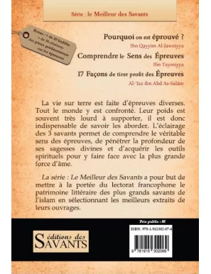 Les éditions des Savants ont donc rassemblé les écrits d'Ibn Qayyim Al Jawziya, Ibn Taymiyya et Al 'Izz Ibn Abd As-Salam dans un seul et même ouvrage. Leurs explications éclairantes vous aideront à saisir la raison des épreuves. Elles vous permettront aussi de prendre conscience du fait que l'adversité peut et doit nous rapprocher d'Allah.