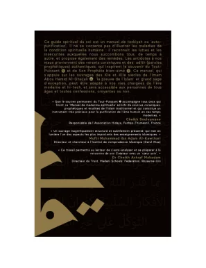 « Que le soutien permanent du Tout-Puissant accompagne tous ceux qui liront ce ‘Manuel de médecine spirituelle’ enrichi de sources coraniques, prophétiques et érudites de l’Islam traditionnel et qui constitue un instrument très précieux pour la purification de l’âme humain en ces temps modernes. »