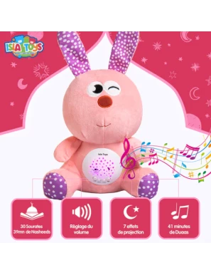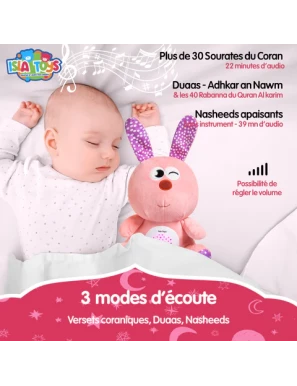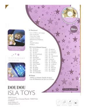 Cette peluche est parfaite pour les enfants qui aiment les doudous avec des versets coraniques , des Douas, des nasheeds a paisants et relaxants .